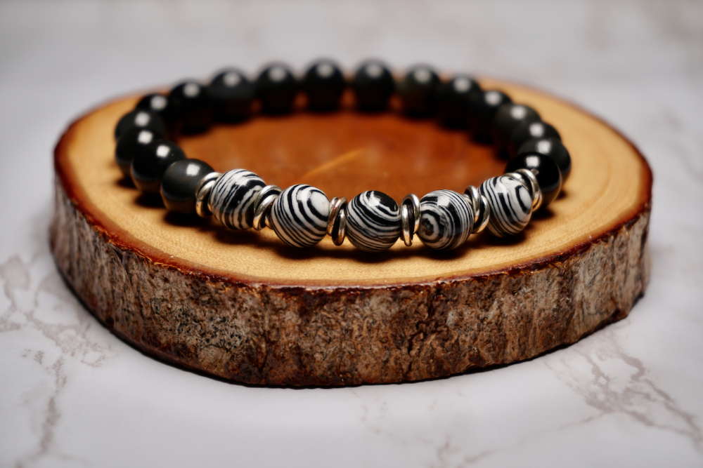 Design: Black Obsidian, Black Zebra Jasper & 6 Sterling Silver Spacers