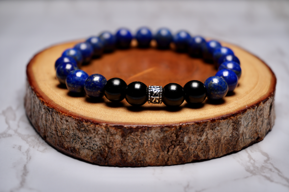 Design: Lapis Lazuli, Black Onyx & 1 Sterling Silver Om Mani Padme Hum Piece